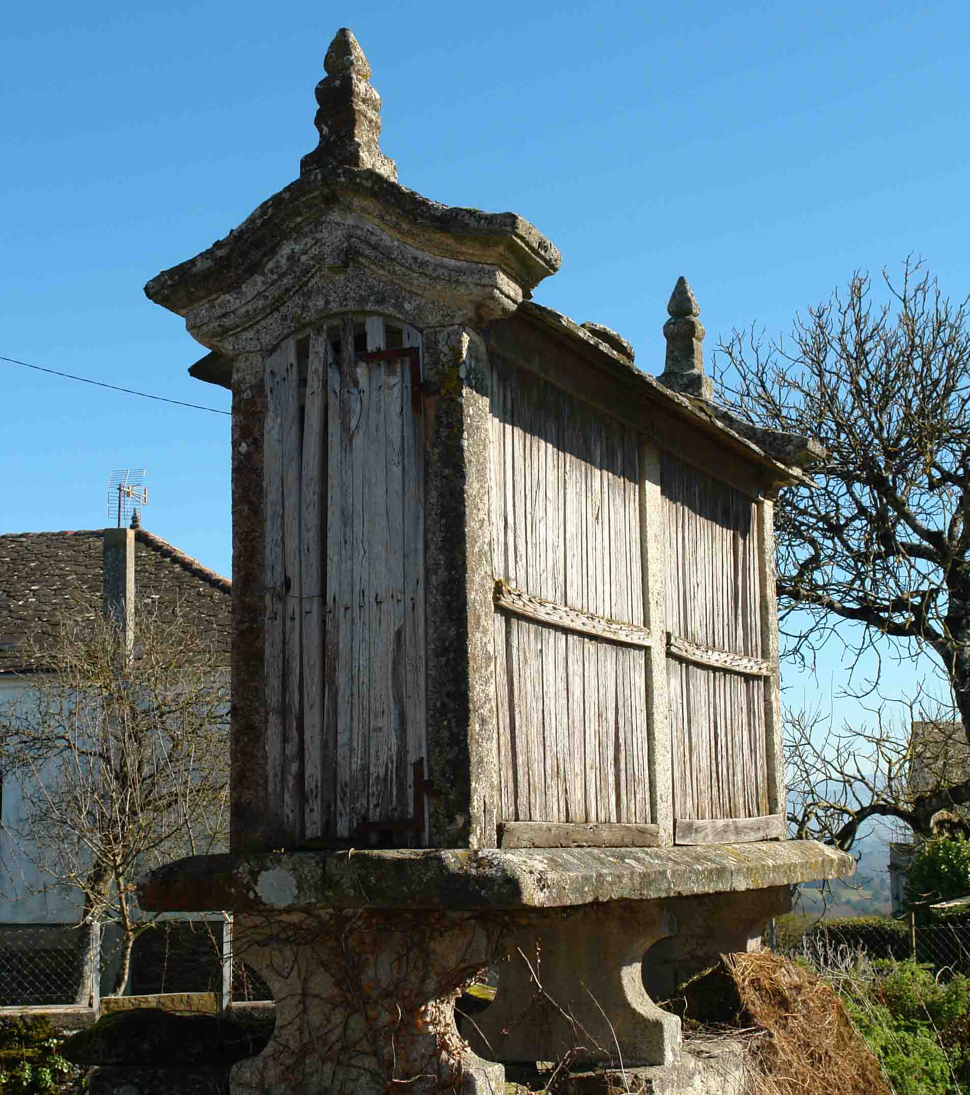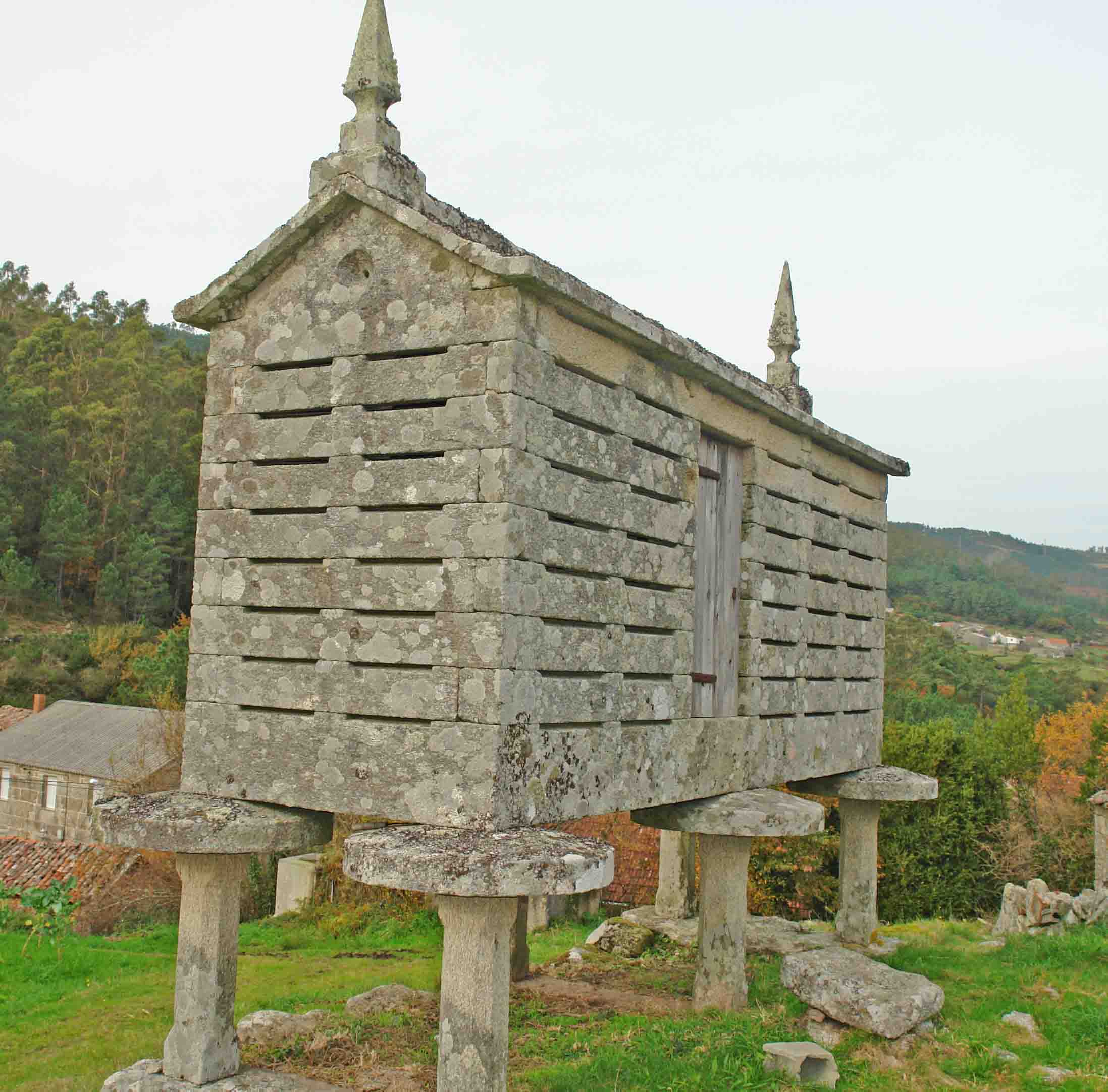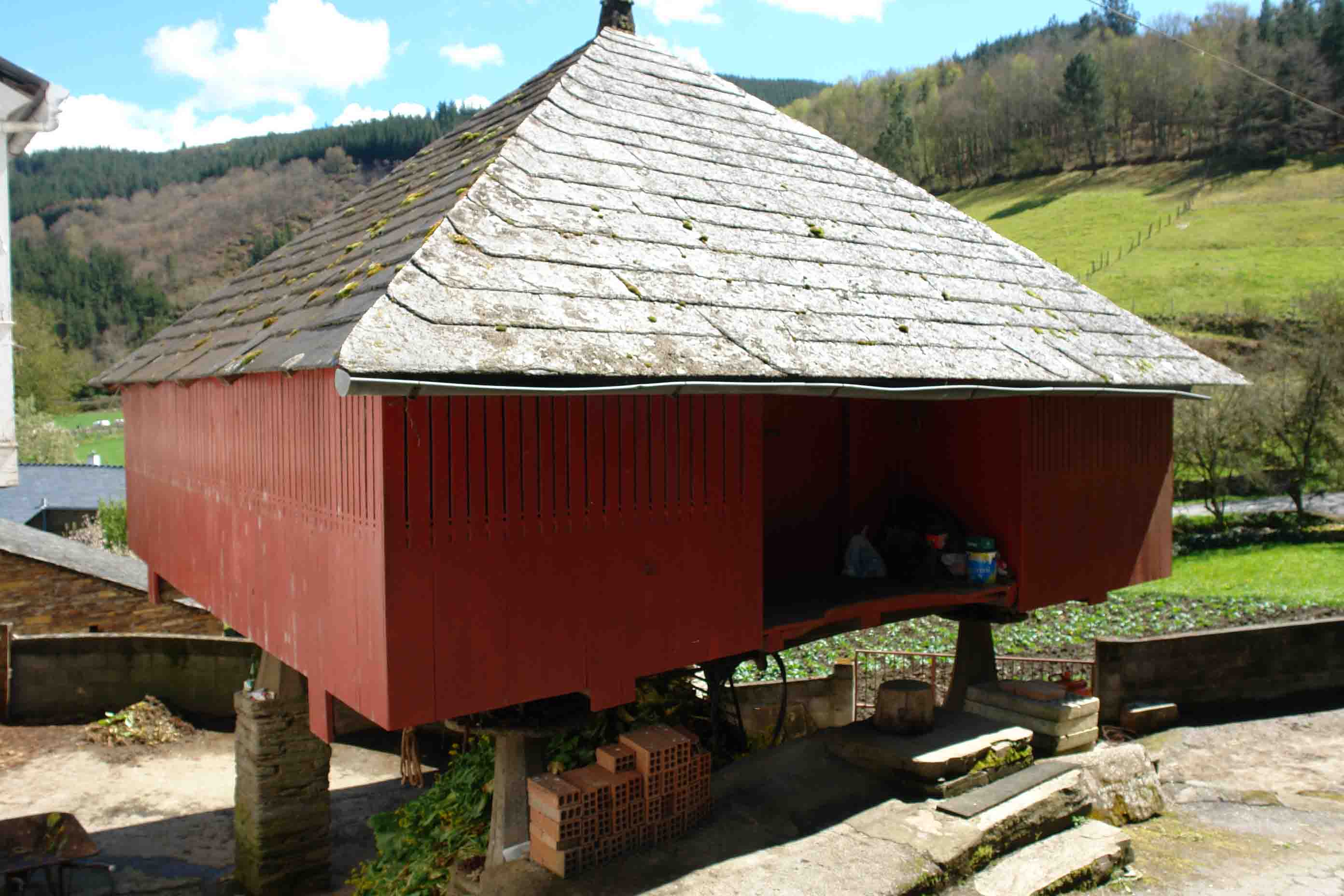 Pueden ser cuadrados y también octogonales. Tienen doble función, un parte interior cuadrada para guardar, trigo,centeno, etc y un corredor exterior a su alrededor donde se guarda el maíz. Se eleva sobre pies de madera o cachotería.