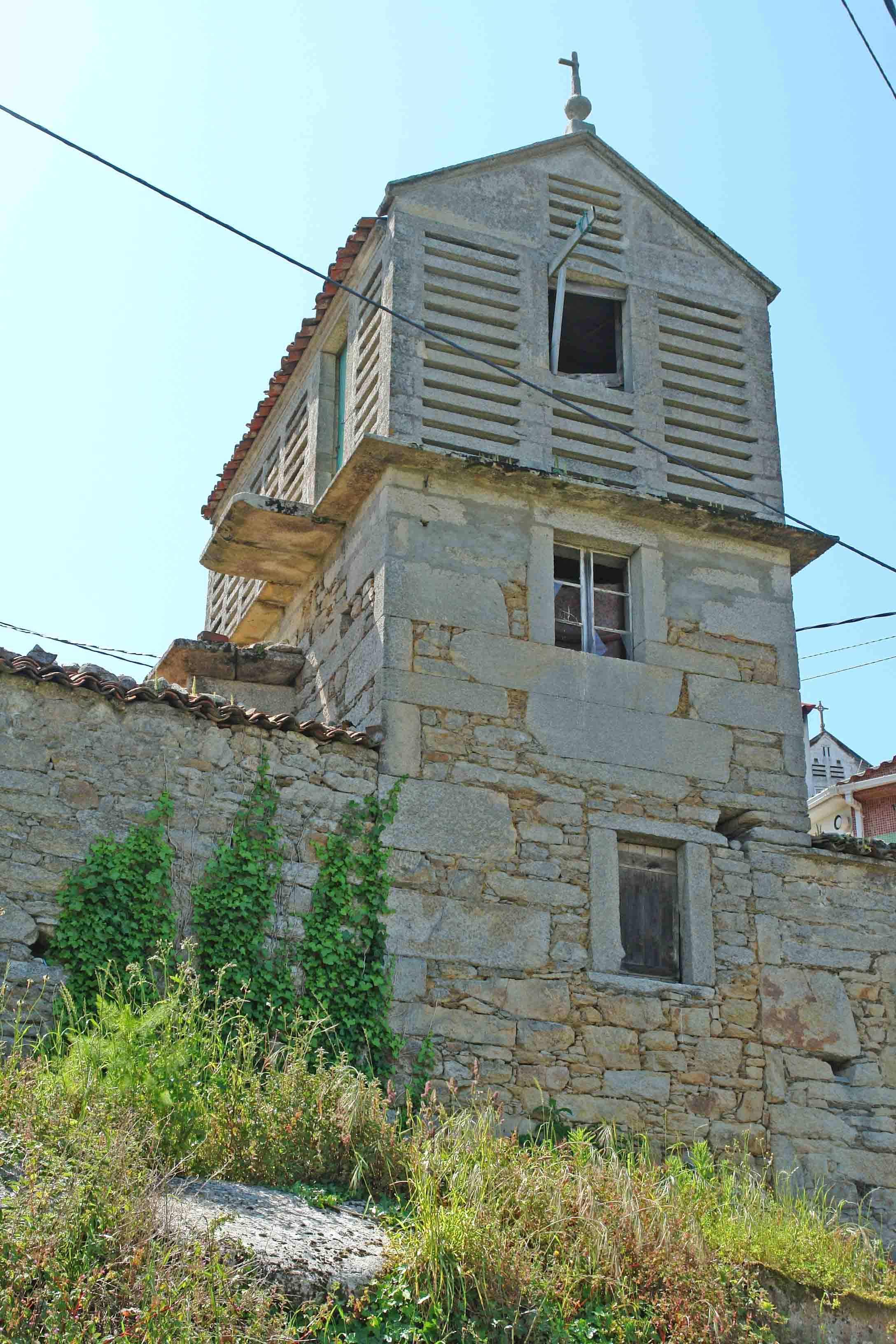 Se eleva sobre celeiros, que pueden ser de uno o dos pisos, hechos de cachotería.