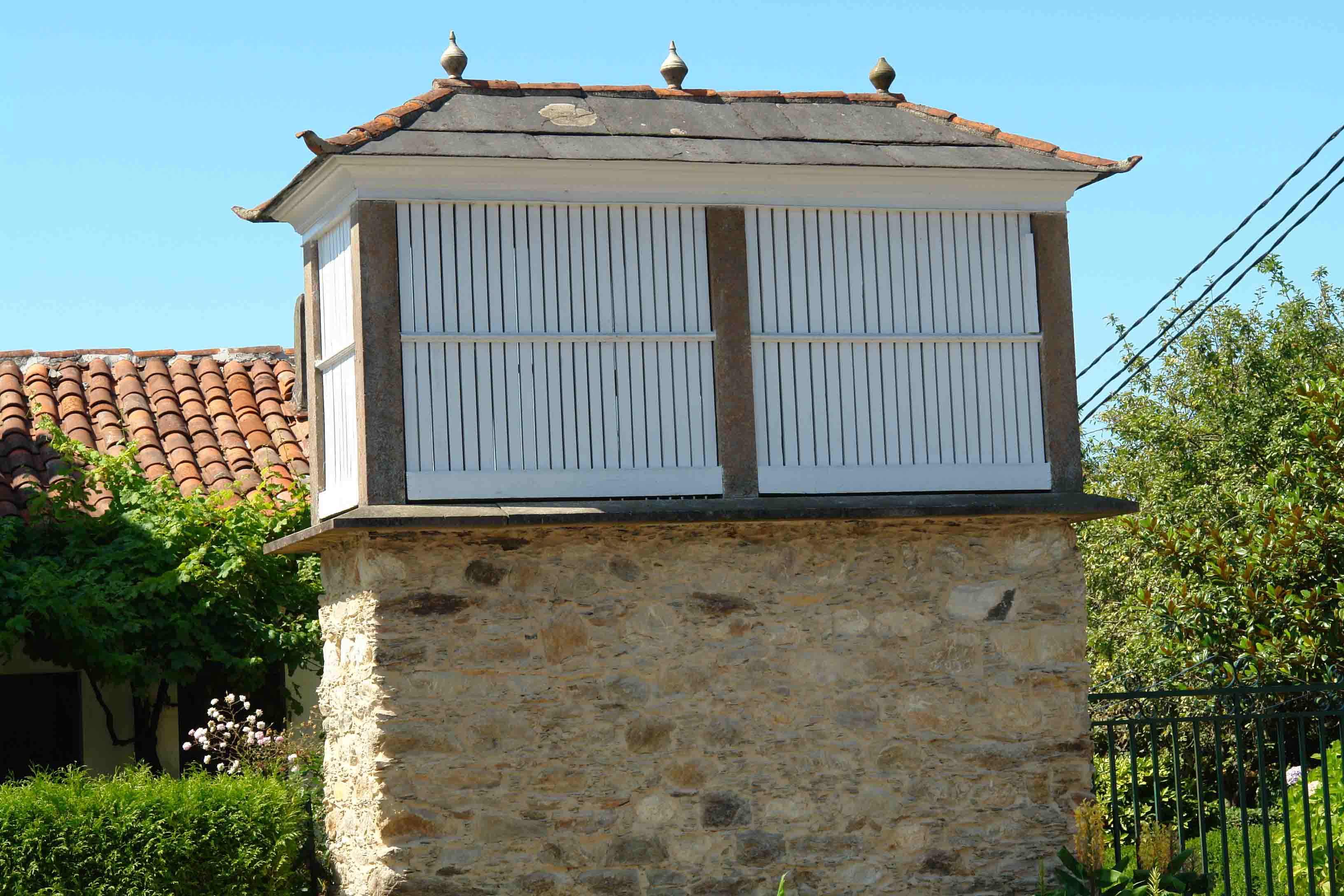 Se elevan sobre celeiros de una o dos planta, son anchos con un corredor central y al otro extremo de la puerta, una ventana.