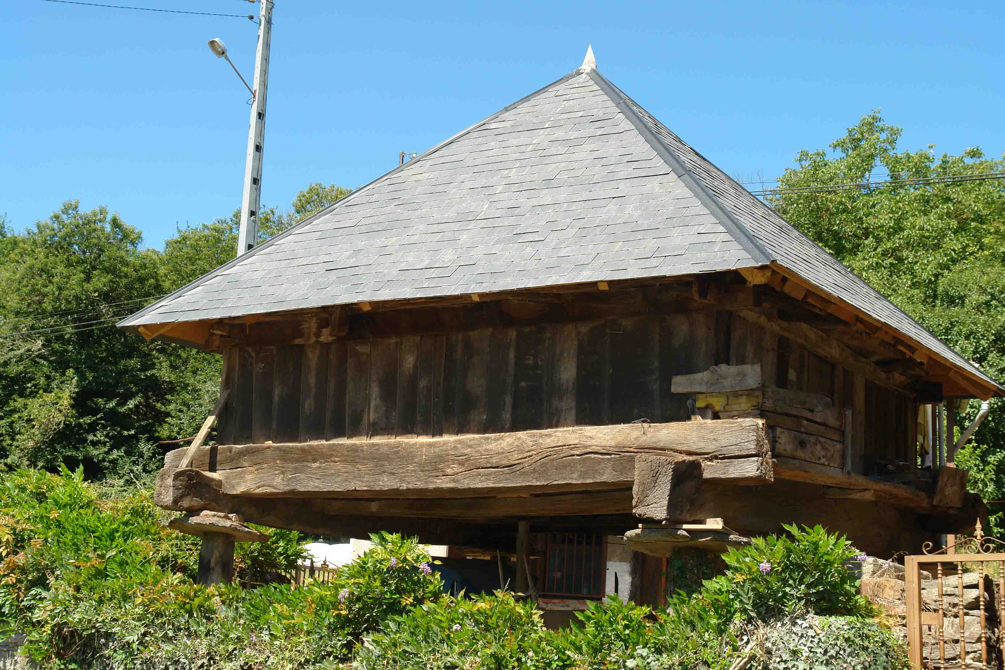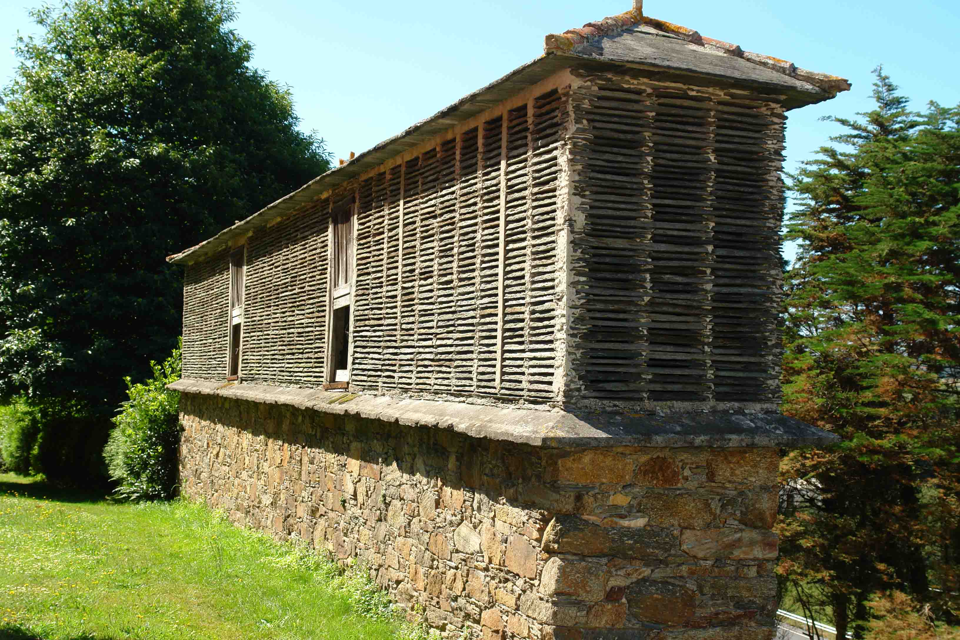 El cuerpo del granero está formado por estrechas columnas y entre ellas pequeñas piezas de pizarra, separadas entre sí.